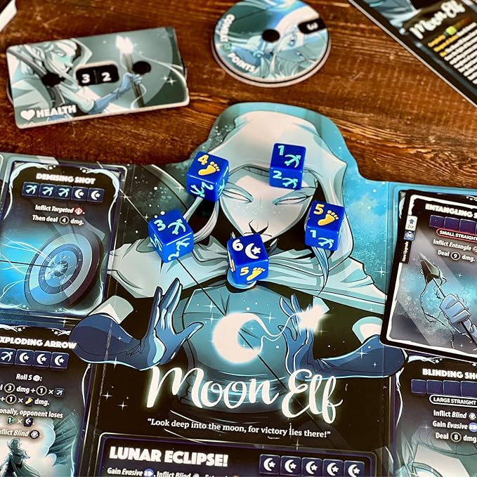 - HEROES CLASH IN HEAD-TO-HEAD DUEL: Enter the arena with Barbarian and Moon Elf, each with unique abilities, themed attacks, and custom dice. Face off in an epic battle where every roll counts.