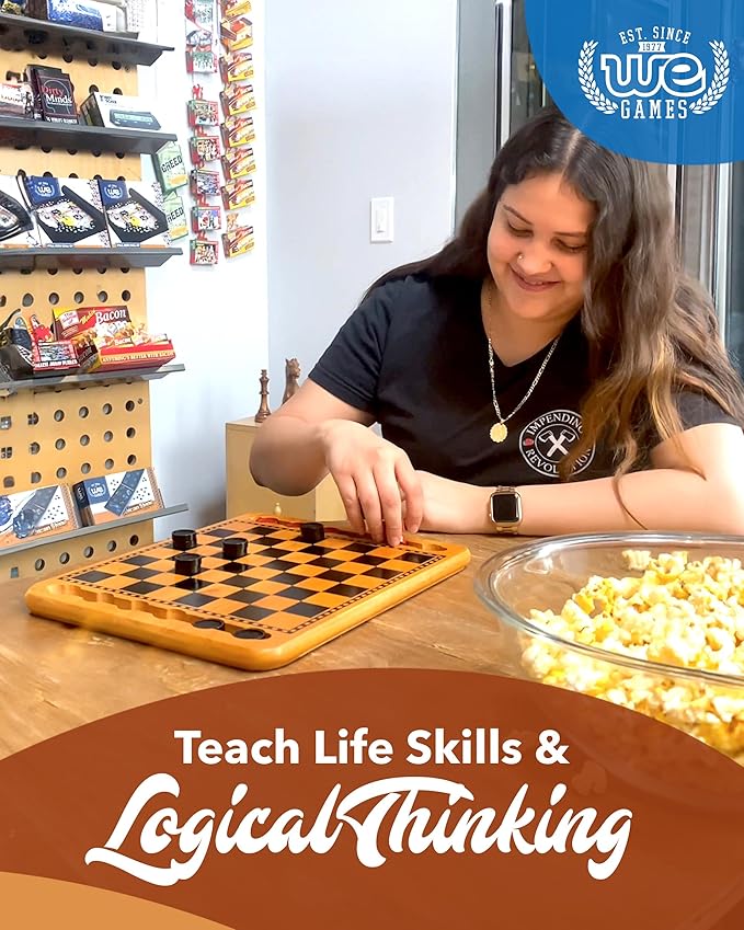 WE Games Solid Wood Checkers Board Game – 14.5-Inch Vintage Checkers Set with Inset Grooves & 24 Red & Black Board Game Pieces – Fun Family Table Game