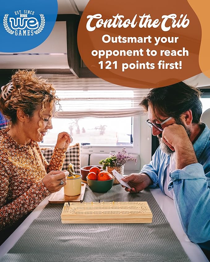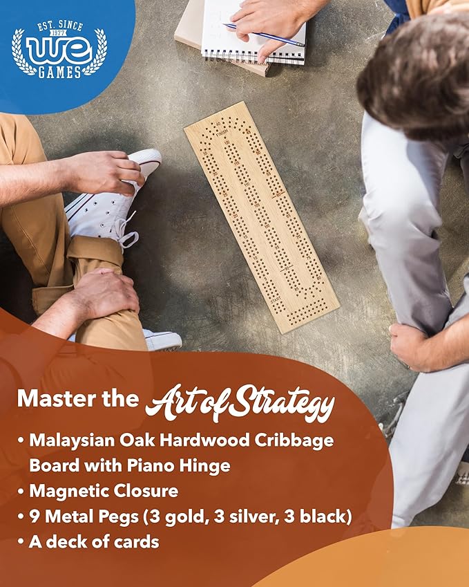 WE Games Wooden Cribbage Board Game Set, Continuous 3 Track for 2-3 Players, Travel Cribbage Board with Card Storage, Includes 9 Metal Pegs & Deck of Cards, Card Games, Classic Board Games for Adults