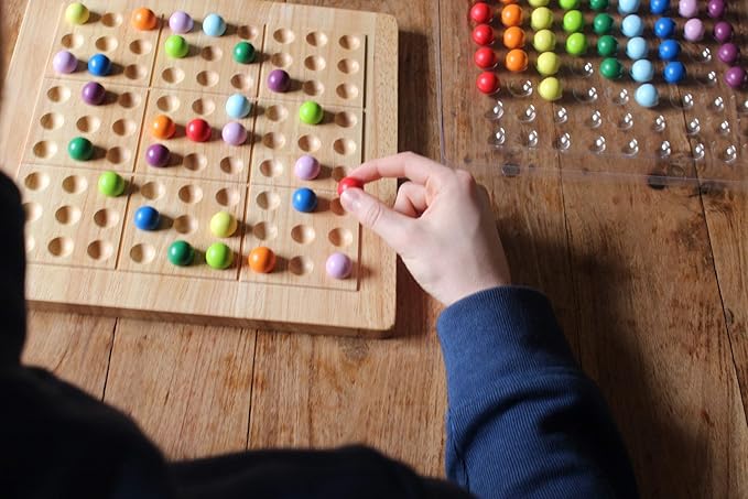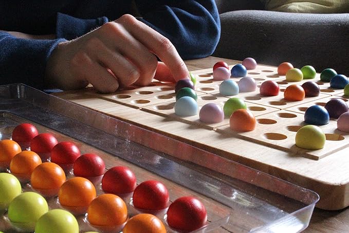 - 81 small colored wooden balls (9 red, 9 orange, 9 yellow, 9 light green, 9 dark green, 9 light blue, 9 dark blue, 9 indigo, 9 violet)