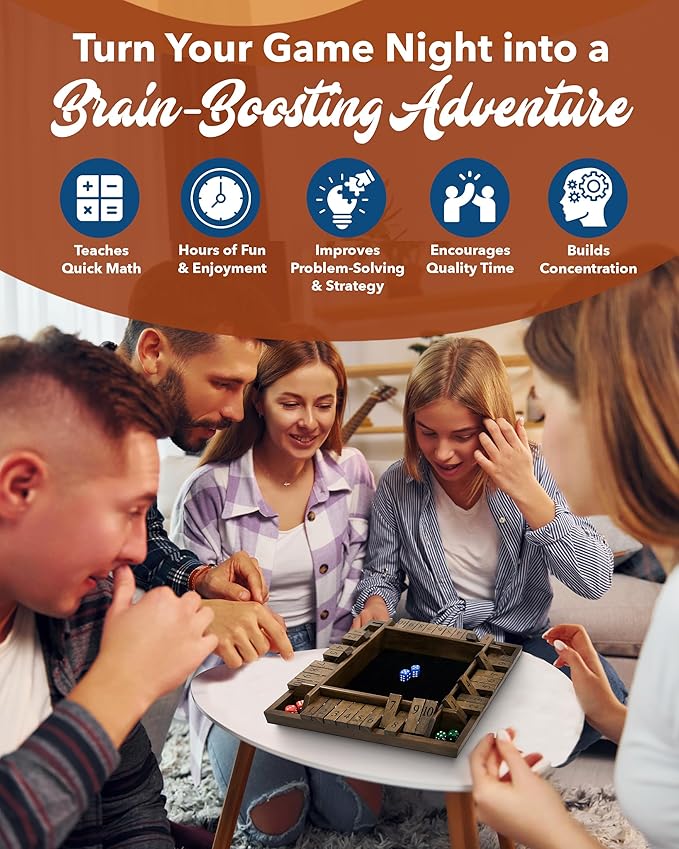 - Bigger Board, More Fun: With a larger 14-inch board and 10-number flip tiles in this shut the box dice game, you can roll, match, and score in even more exciting combinations. Plus, 8 dice for 1 to 4 players means quicker turns and a more engaging experience!