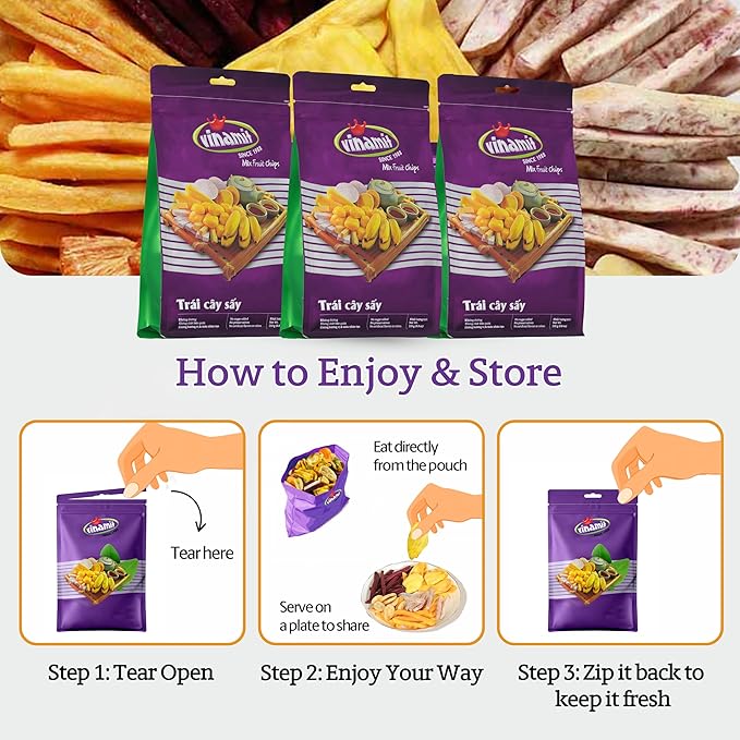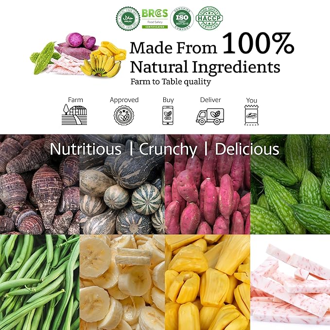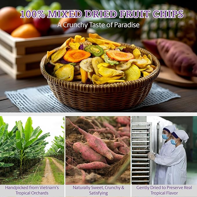 - TROPICAL FRUIT BLEND, NO SUGAR ADDED: A delicious mix of banana, jackfruit, sweet potato, taro, and pineapple. These dried fruit chips are naturally sweet, with no added sugar or preservatives—perfect for clean eating.