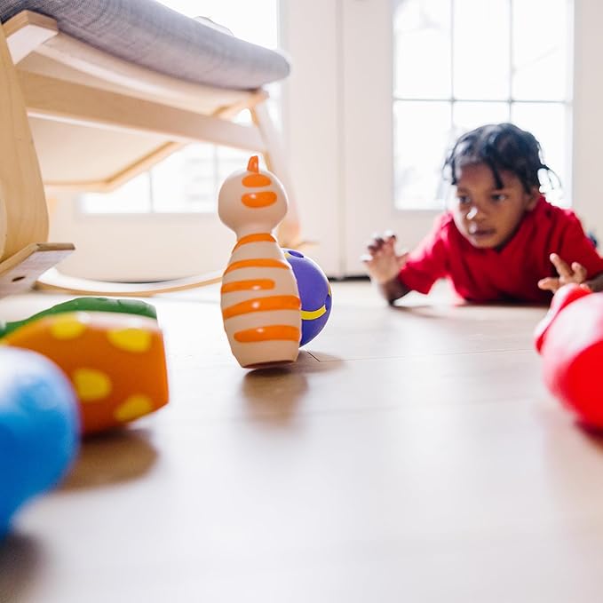 - 7-piece soft-plastic bowling set for toddlers and preschoolers