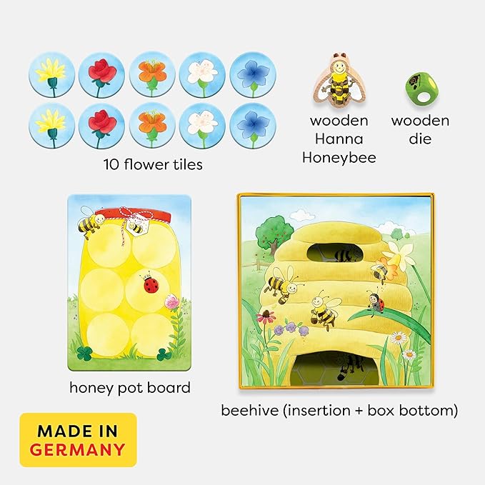 - COOPERATIVE FAMILY GAMES: Roll a die & move the wooden Hanna token to a flower of that color. Insert the tile in the hive, then add the honey to the pot. Work together to collect 6 honey tiles.