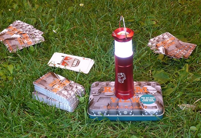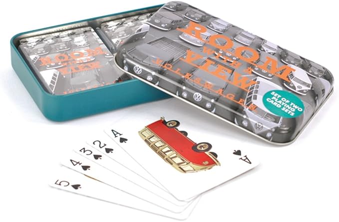 - A ROOM WITH A VIEW/PLAYING CARDS: The VW game consists of 2 sets of 52 playing cards and 2 joker cards. The cards feature a red VW T1 Bus in the center. Box dimensions: 9.5 x 24 x 14.5 cm (3.7 x 9.4 x 5.7 inches).