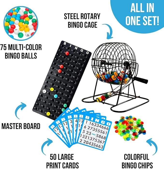 - Quick Setup: This Bingo set is easy to set up, getting you ready for an exciting game in minutes. It includes a 6” steel rotary bingo cage, colorful bingo chips, 50 large bingo cards, 75 bingo balls, a master board, and instructions.