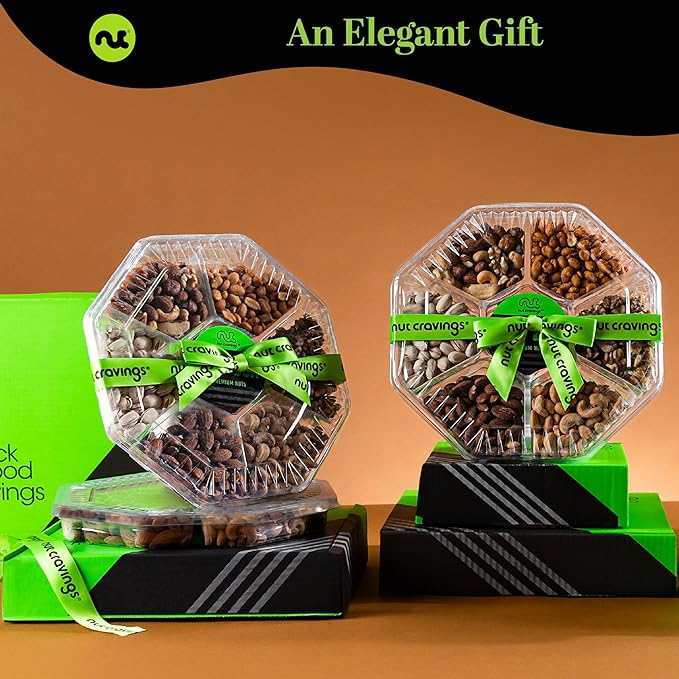 - TOP 'NUTCH' PACKAGING WITH GREEN RIBBON: High-end packaging featuring a unique and sophisticated design. Plus, our nuts come in a covered sturdy and clear 7 sectional hexagon shaped tray wrapped with a green ribbon that makes it elegant and easy for you to share them with the people you love.