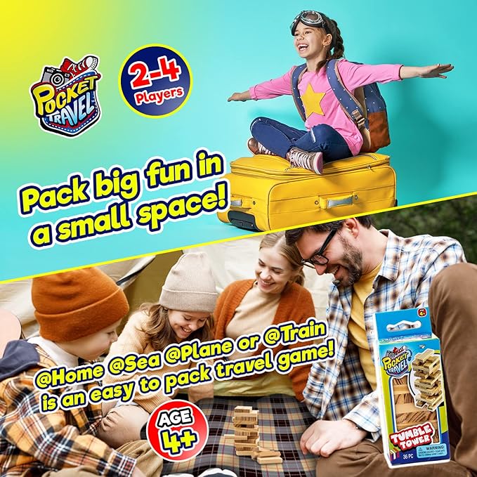 - 6 INDIVIDUALLY PACKED WOODEN MINI TUMBLE TOWERS PACKS. Great Family Board Games. Party Games For Kids And Adults. Travel Games, Table Games, Family Games. Includes 1 Funaton Bouncy Ball.
