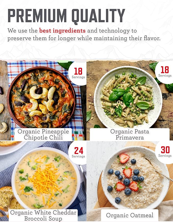 - NUTRITIOUS MEALS: Our survival food kit offers not only convenience but also tasty, nutrient rich options like pineapple chipotle chili, pasta primavera, white cheddar broccoli soup & oatmeal to enhance your outdoor meals or emergency kit reliably.