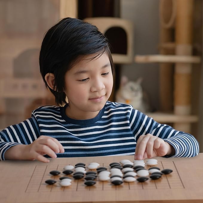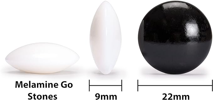 - Double Convex Stones: Melamine is an exceptionally durable compound; These are excellent stones to use whether you're an amateur or an avid go game player; The stones produce a satisfying feel and snap to them; Includes 181 black and 180 white size 33 stones each measuring 9 x 22-millimeter