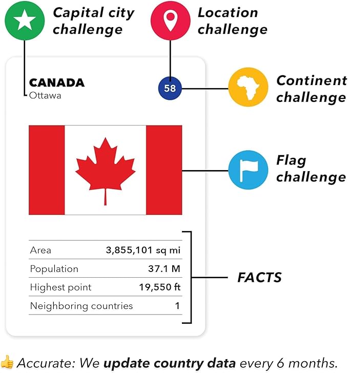 - Up-to-date Geography Game - An award-winning world learning card game. Can also be used as flash cards or trivia. Country's data is updated regularly.