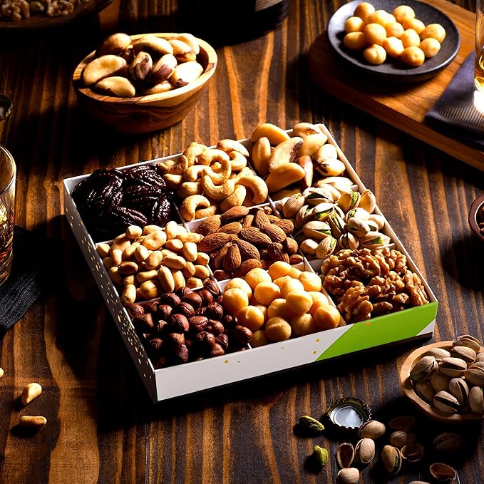 - A SELECTION OF 9 OF OUR BEST NUTS: Our Green & White Gift Box includes a handful of 9 of our signature nuts: Honey Glazed Pecans, Cashews, Brazil Nuts, Pistachios, Walnuts, Almonds, Blanched Hazelnuts, Hazelnuts, and Peanuts.