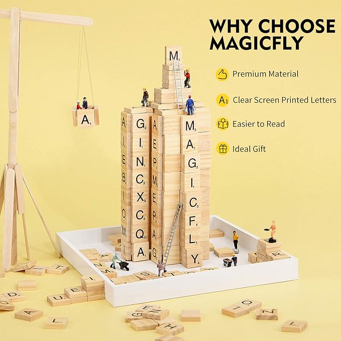 - 【Premium Material】 Magicfly Scrabble Tiles are made from solid wood. Clear screen printed letters and numbers make it easier to read and hard to wear off.