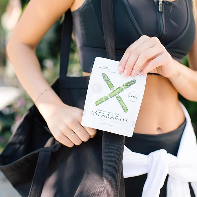 - HEALTHY SNACKS ON THE GO: Poshi Marinated Asparagus are a tangy, crunchy and delicious treat you can enjoy anywhere. They satisfy your savory snack craving without the junk. It’s real food made with simple ingredients & conveniently packaged so you’ll never have to reach for empty calories again.