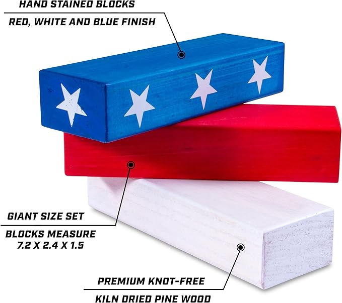 - STARS AND STRIPES DESIGN: Plays just like the classic stacking game with the added fun of America themed blocks; Great for family game night, holiday weekends, cookouts and more; U.S. Patented Product