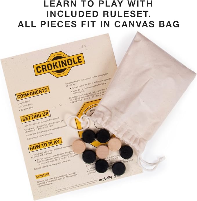 - What's Included: 27 Inch wood crokinole board with 24 black and white discs which work for checkers as well. Instructions included
