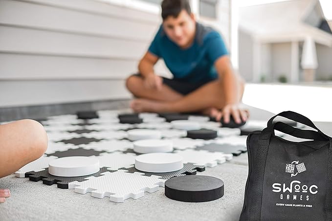 SWOOC Games - 2-in-1 Premium Giant Checkers & Tic Tac Toe Game (4ft x 4ft) - 100% High Density EVA Foam Mat & Pieces - Extra Large Checkers Set with Jumbo Checkerboard and Yard Size Tic Tac Toss