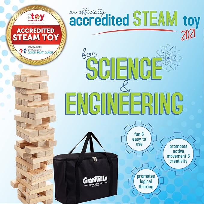 - 2021 STEAM Accredited: Not only is this toy fun for everyone, but it also promotes logical thinking, active movement and creativity! So, get the whole family involved! The Jumbo Wooden Blocks Game provides hours of entertainment for everyone of all ages. Children and adults will love the thrill and excitement! Block measures 6.4" L x 2.1" W x 1.2 ".