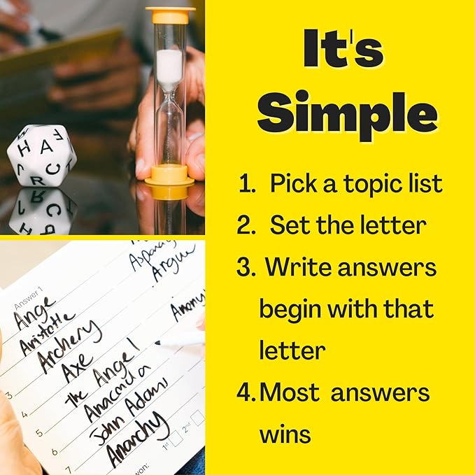 - How To Play: Draw a card to set the topics, and roll the die to set the letter that your responses must begin with. Flip the sand timer and you're off! Race against time to write down answers for each topic that begin with the letter rolled.