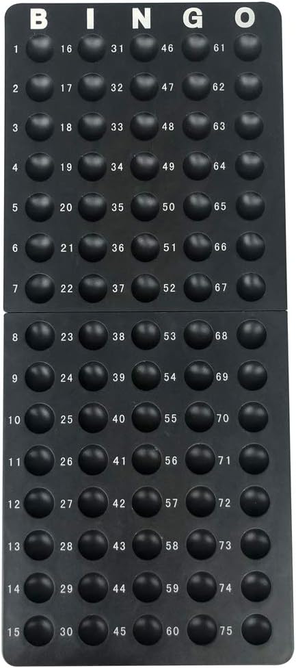 - Black bingo board is made from two piece of solid plastic that hook together at the top and bottom. The boards hold a combined total of 75pcs balls. Measures:13.58"(34.5cm) long and 5.9"(15cm) wide.