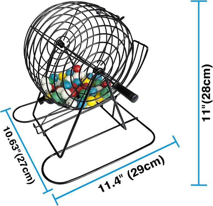 - High quality metal cage with smooth protective black finish and automatic bingo ball selector.Overall dimensions of the cage: 11.4"(L)*10.6"(W)*11"(H)