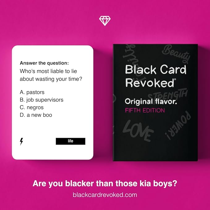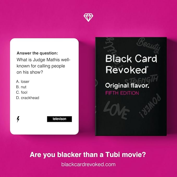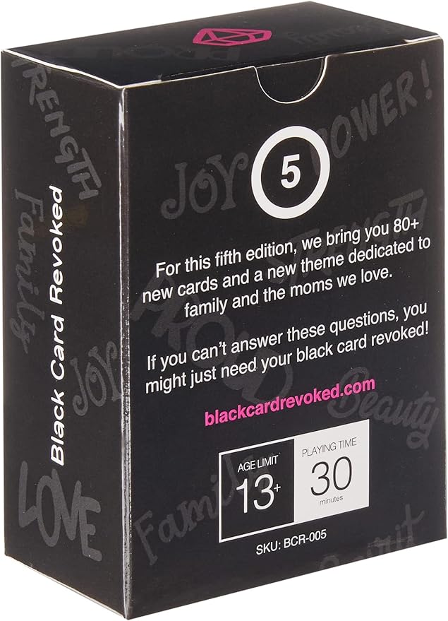 - AMERICA’S #1 CULTURAL GAME: The fifth edition of Black Card Revoked - Original Flavor is here. We doubled down on fun questions about the moms and families we love. Don't have a whack party. Get the game today and don’t get your Black Card Revoked!
