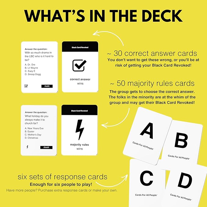 - WHAT'S IN THE DECK: This deck comes with ~ 30 correct answer cards and you don't want to get these wrong, or you'll be at risk of getting your Black Card Revoked! It also comes with ~50 majority rules cards. For these cards, the group gets to choose the correct answer. The folks in the minority are at the whim of the group and may get their Black Card Revoked! This deck also comes with six sets of response cards, enough for six people to play. Have more people? Purchase extra response cards or make your own. Let the fun begin!