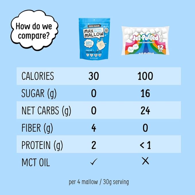 - Deliciously fluffy and sugar free - Max Mallow Sugar Free Marshmallows offer a delightful treat without the guilt! Enjoy the classic fluffy texture and sweet flavor of sugar free marshmallows, perfect for satisfying your sweet tooth while staying on track with your dietary goals.