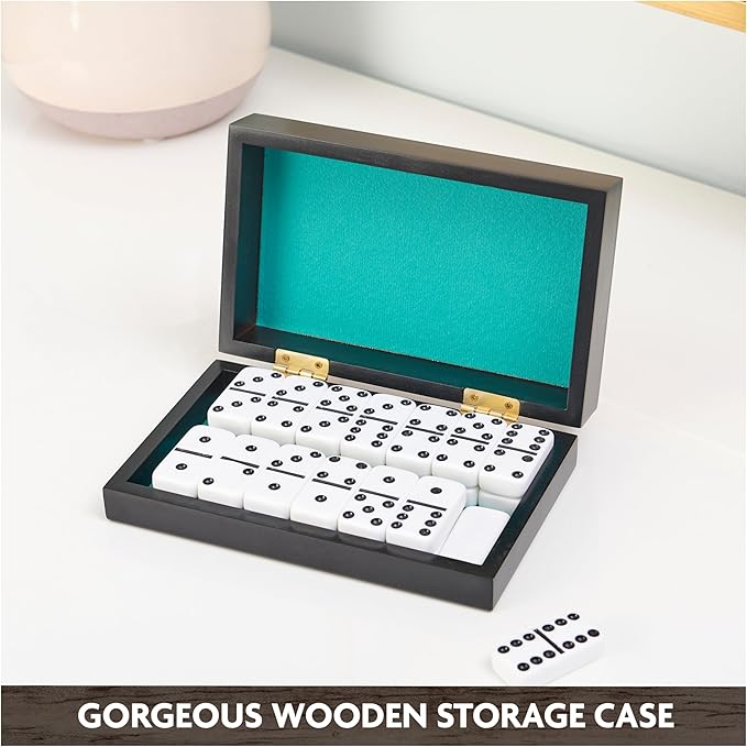 - Includes: 28 Dominoes, Wood Case, Instructions
