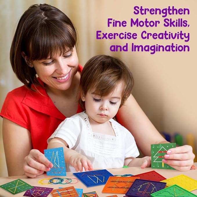 - AMAZING BOARD TO CREATE AWESOME PATTERNS - Time to enhance those creative minds! Stimulate children's creativity and imagination, keep their hands busy with these plastic board and rubber bands geometry toy. Your child can use them to create a variety of shapes, letters, animals, trees, and other objects, the possibilities are endless