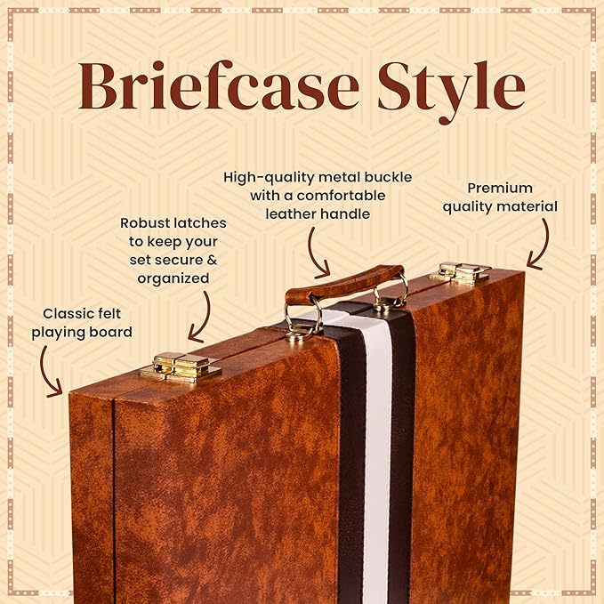 Backgammon Set 15 inch, Medium - Classic Board Game for Adults and Kids with Premium Leather Case - Includes Strategy & Tip Guide (Brown)