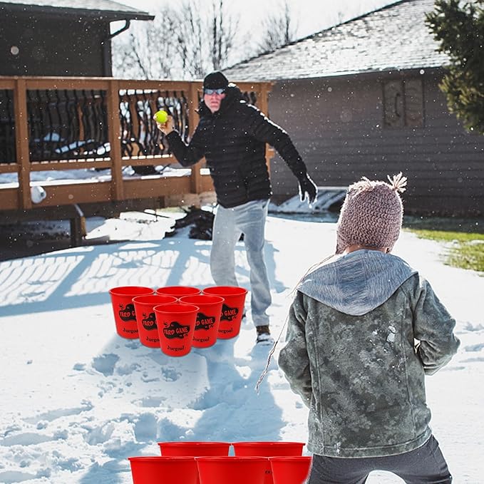 - Outdoor Toss Game Set: Includes 12 red buckets, 4 balls- 2 white hollow balls, 2 yellow tennis balls, black carry bag & instructions. Easy to understand game play and flexible rules, suitable for all kinds of people, whether children or adults, beginners or advanced players. Enjoy your favorite outdoor toss games!