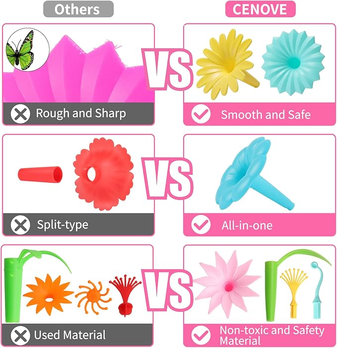 - Safety Toddler Toy:CENOVE pretend flower garden toy set is made with Eco-friendly materials. BPA-Free,Non-toxic, No smell.Smooth surface,won't hurt kids' hands.Meet with ASTM F963-16/-17 and CPSIA safety standards.