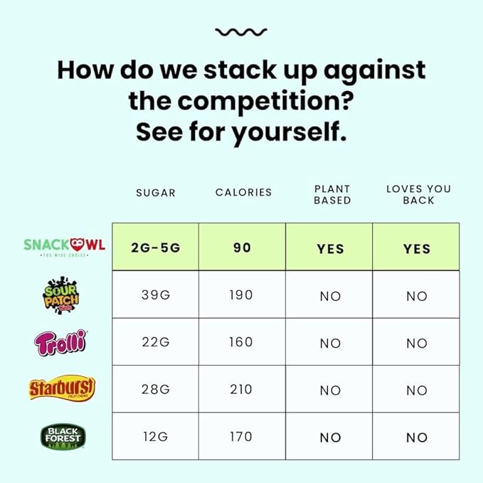 - BETTER-FOR-YOU SNACKING: You deserve to live in a world where indulging doesn't feel guilty - and our mission is to make that possible. Each bag of vegan candy has only 2g of sugar, 90 calories and 0g of guilt.