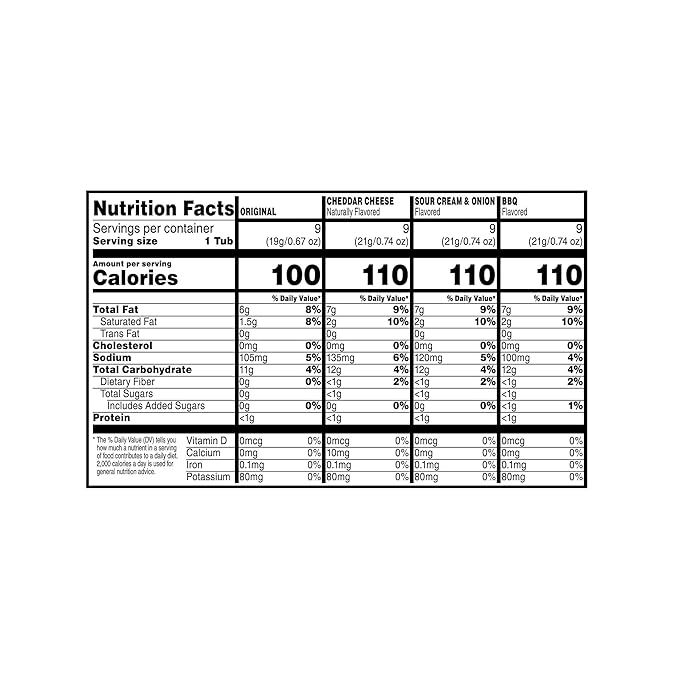 - Convenient cups of stackable potato crisp varieties seasoned to savory perfection from edge to edge; Always tasty, never greasy