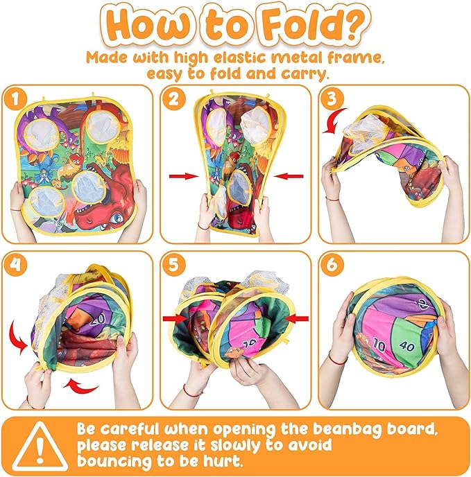 - 【Easy to Assemble & Storage】: Just open the package and take out the corn hole board, then glue the magic stickers on both sides. Easy to carry the bean bag toss toy to the park, yard, beach, back yard, lawn, camp, picnic, playground and so on. Meeting every needs in the portable travel. Great outdoor toys for toddlers age 4-8!