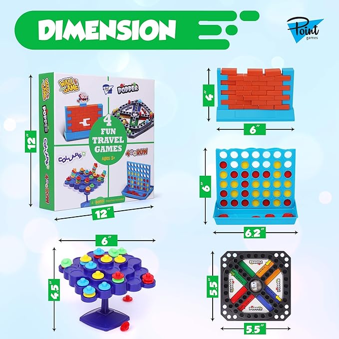 - WHATS INCLUDED: Four fun travel games for ages 5 and up includes; the wall game, popper, collapso, and four in a row. Makes a great gift for kids, surprise children on their birthday, holidays, or any other commendable event.