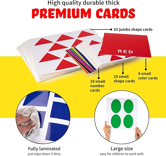 - Includes 25 Shapes, Colors and Number Laminated Jumbo cards floor cards and 35 'Show It' small Laminated cards, User manual with multiple games uses included