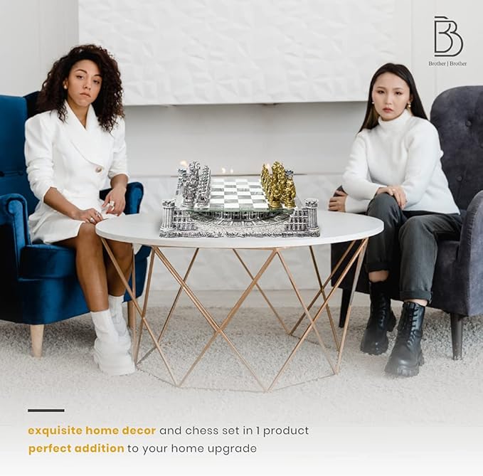 - Beautiful Work of Art - An exquisite home decor and chess set in 1 product! Inspired by the brave Roman gladiator warriors of the Ancient times. Each set comes with 32 uniquely detailed chess pieces - 16 gold pieces and 16 silver pieces. The glass chess board is strategically suspended above the beautifully crafted replica of the Roman Amphitheatres Arena, making this set a perfect addition to your home upgrade.