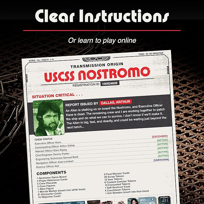 - Learn to Play Online – Learn to play from a step-by-step rulebook with clear diagrams and visuals, or search for “Watch It Played: ALIEN Fate of the Nostromo” on YouTube for an online tutorial.
