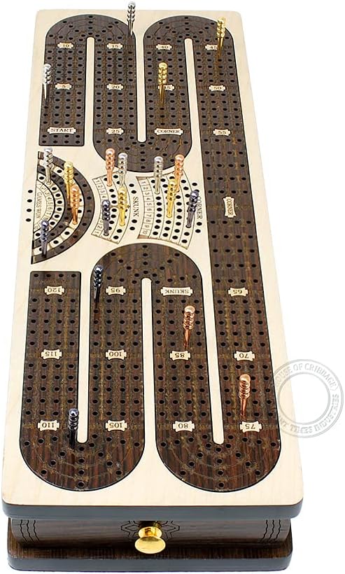 Continuous Cribbage Board/Box Inlaid in Maple/Rosewood : 4 Track - Storage Drawer for Pegs & Playing Cards - Score Marking Fields for Skunks, Corners and Won Games