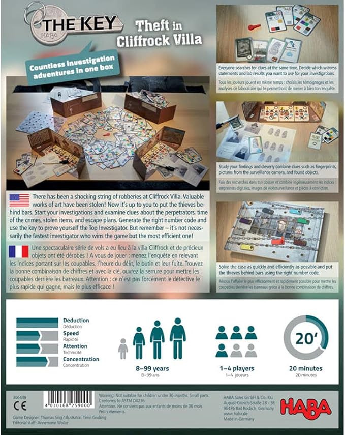 - The players must investigate clues about the perpetrators, analyze forensic lab reports and read witness statements, while also examining what has been stolen, the time of the crimes, and the suspect’s escape plans. Once all the clues and evidence have been evaluated, players need to enter the right number code in order to put the thieves behind bars. In the end, the winner isn’t necessarily the speediest investigator but the one who did so in the most streamlined and efficient way.