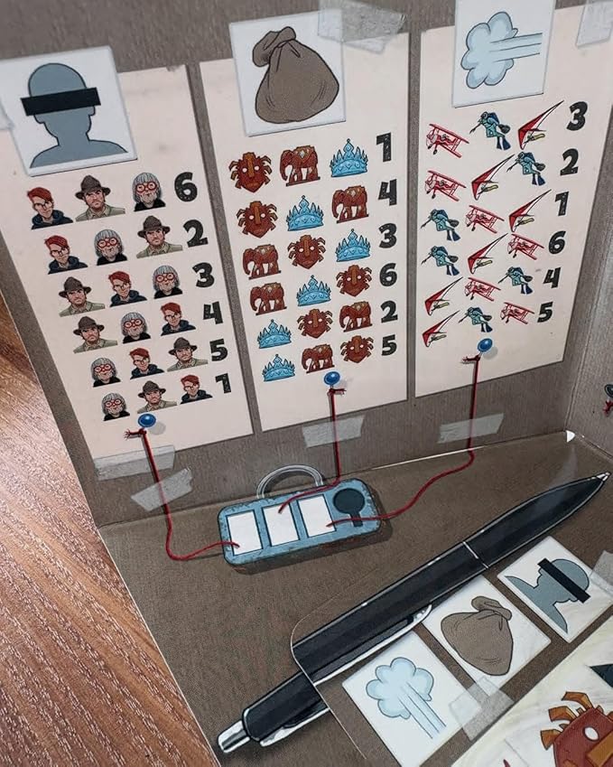 - Includes 4 dry-erase player shields and "briefcase" notepads, 4 dry-erase markers, 140 cards with rules, 9 wooden keys, 1 solution board and 1 rulebook. Made in Germany.