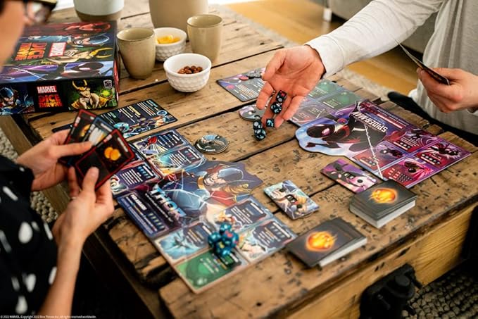 - Includes: 4 Hero Boards (Scarlet Witch, Thor, Loki, Spider-Man), 4 Leaflets, 4 sets of 5 dice (1 set each hero), 132 Hero Cards, 4 Combat Point (CP) Dials, 4 Health Dials, Rules