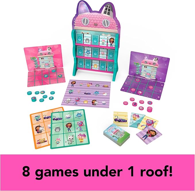 - 8 GAMES UNDER 1 ROOF: It’s crowded in this Games HQ, with 8 meow-mazing games all centered around the included Gabby’s Dollhouse With imaginative twists on classic games, it’s time to come in & play
