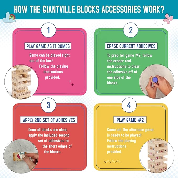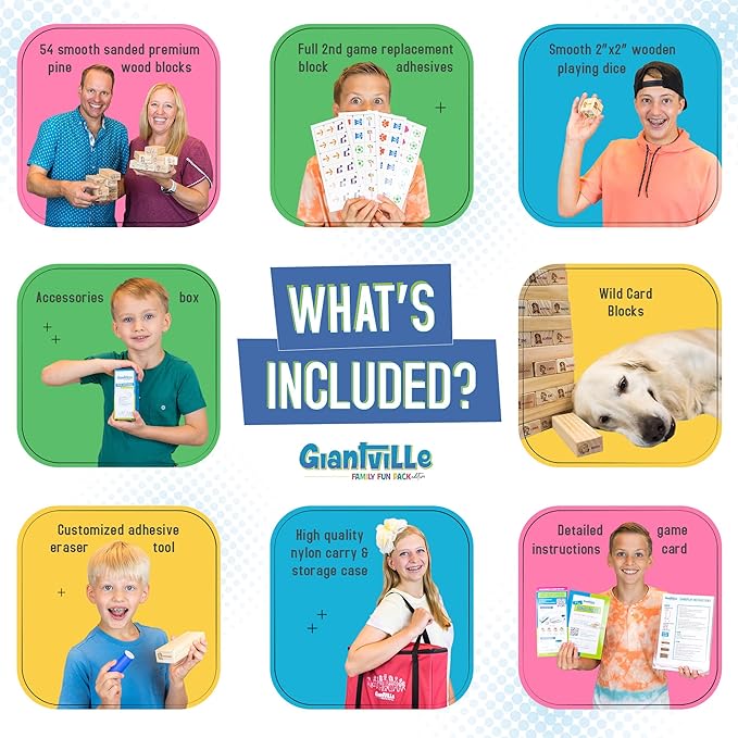 - INCLUDES DICE + COLORFUL ADHENSIVES - Giantville has once again revolutionized the classic tumbling tower game by not only including the die, but now adding a whole new play-style with the easy-to-remove and reapply colorful shape adhesives. This adds unlimited variations on how to play the game, so you will never run out of ideas and you're never get board.