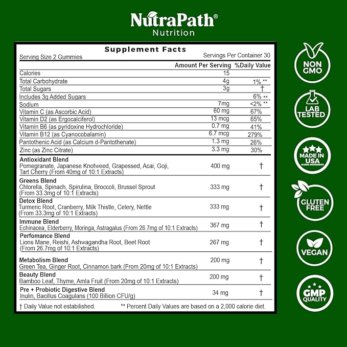 - Each NutraPath SuperGreens gummy is loaded with good-for-you superfoods and greens such as Pomegranate, Japanese Knotweed, Grapeseed, Acai, Goji, Tart Cherry, Chlorella, Spinach, Spirulina, Broccoli, Brussel Sprout, Turmeric, Cranberry, Milk Thistle, Celery, Nettle, Echinacea, Elderberry, Moringa, Astragalus, Lions mane, Reishi mushroom, Ashwagandha, Beet Root, Green Tea, Ginger, Cinnamon Bark, Bamboo Leaf, Thyme, Amla Fruit, Inulin, and Bacillus coagulans.