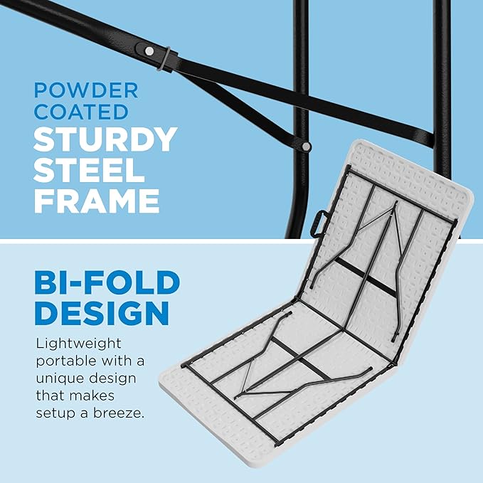 - HEAVY DUTY STURDY & STABLE - Lightweight and portable, this plastic folding table features an impact-resistant resin surface, waterproof & easy to wipe clean, and is supported by a heavy duty steel framework. The reliable anti-arch lock keeps it steady and stable on any indoor or outdoor surface.