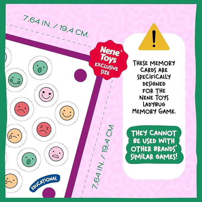 - โ ๏ธ EXCLUSIVELY SIZED FOR NENE TOYS: These memory cards are a unique size, specifically designed for the Nene Toys Ladybug Memory Game. Measuring 7.64 inches x 7.64 inches (19.4 cm x 19.4 cm), they cannot be used with other brands' similar games!