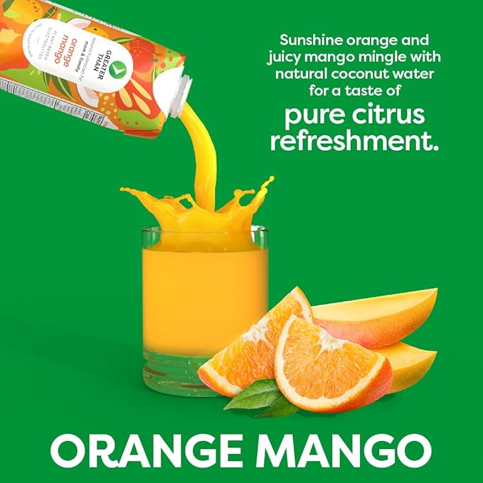 - ORANGE MANGO, ALWAYS ON HAND: From morning drop-offs to afternoon workouts and family outings, GREATER THAN keeps you refreshed on the move. Bursting with bright citrus and tropical mango, this flavor delivers a juicy, sunshine-forward sip that’s both revitalizing and portable—made with real fruit juice and coconut water for hydration that keeps up with your day.